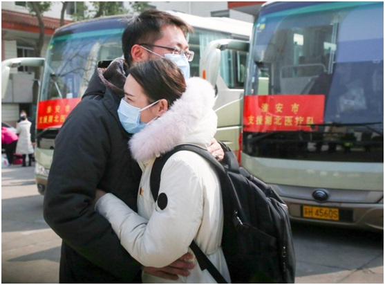 On Feb. 9, a man sees off his wife in Huai’an, east China’s Jiangsu province, before the woman, who’s among the second batch of medics sent by the city to Hubei, departs for the epicenter to help epidemic control and prevention there. Photo by Wang Hao, People’s Daily