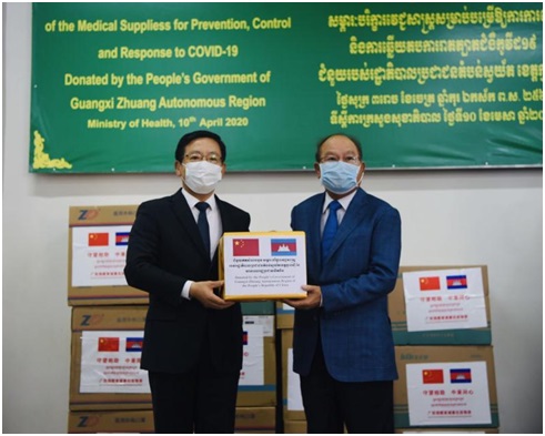 Wang Wentian, Chinese Ambassador to Cambodia (L) and Mam Bun Heng, Minister of Health of Cambodia attend a handover ceremony to mark the medical supplies donated by the government of Guangxi Zhuang Autonomous Region to the Cambodian government on April, 10. (Photo courtesy of Chinese Embassy in Cambodia)