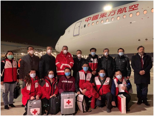 A team of 9 medical experts dispatched by the Chinese government arrives at the Leonardo da Vinci-Fiumicino Airport in Rome, Italy with 31 tons of medical supplies, March 12, local time. (Photo by Han Shuo/People’s Daily)