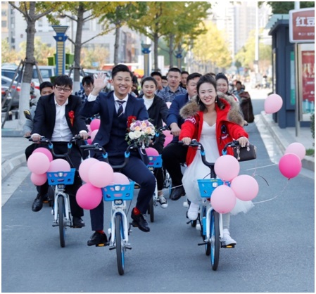 A couple uses shared bikes instead of cars on their wedding day in Huai’an, east China’s Jiangsu Province, October 27, 2018. (Photo: People’s Daily Online)