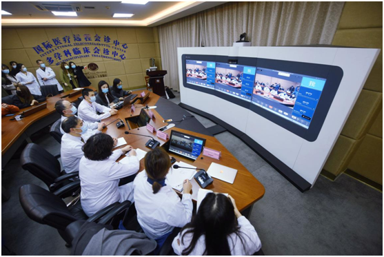 Chinese medical experts discuss treatment plans of COVID-19 with their Mexican counterparts during a video conference held at the international teleconsultation center of Hangzhou Red Cross Hospital, east China’s Zhejiang province, April 3, 2020. Long Wei/People’s Daily Online