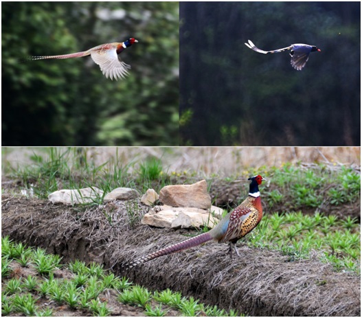 A common pheasant and a red-billed blue magpie fly in the Dabieshan Mountain. Photo by Zheng Jinqiang/People’s Daily Online