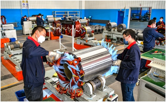 On the morning of March 25, 2020, workers in the large motor workshop of the Hebei large motor workshop at the equipment manufacturing base in Luancheng District, Shijiazhuang City, Hebei Province, are shaping the winding end of the low-voltage high-power motor.