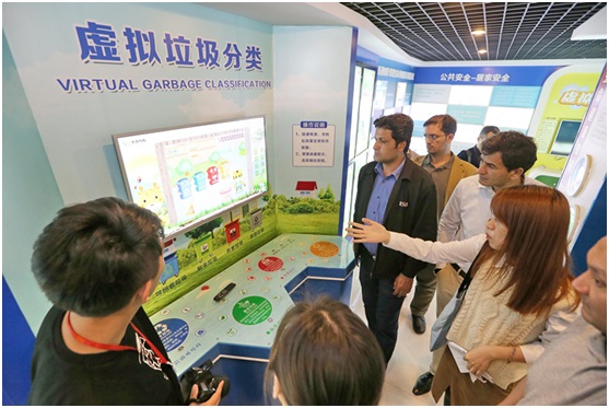 A BRI delegation visits a virtual garbage classification site at a Chinese community science hall, May 9, 2019. (Photo/People’s Daily Online)