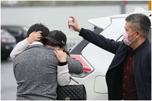 On March 24, Meng Shiqi, a student at the Zhongnan University of Economics and Law, hugs his mother tightly at the Wuhan railway station while his father sprays alcohol for disinfection. Before Wuhan was locked down due to the epidemic over two months ago, Meng visited a friend outside the city and was only able to return home today. (Photo by Liu Yu/People’s Daily Online)