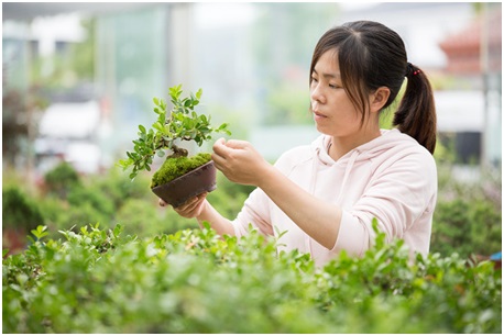 In recent years, regarding the consumer demand changing, Rugao World Flowers, in Jiangsu Province, guide growers to plant small and micro bonsai, and help the bonsai flow to people’s households through the organization of national marketing activities and online promotion. (Photo by Xu Hui from People’s Daily Online)