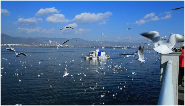 Red-billed gulls from Siberia come to Dianchi Lake, Kunming, southwest China’s Yunnan province to winter, attracting a large number of visitors, Jan. 19, 2019. Photo by Zhu Wenbiao/People’s Daily Online