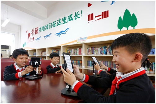 On April 22, 2019, in order to welcome the arrival of “world reading day”, Jiangnan experimental primary school in Huangshan city, Anhui province, held the activity themed “reading pleases heart & book campus”. By reading picture books and e-readers, students will share the happiness of reading. (Photo by Shi Yalei from People’s Daily online)