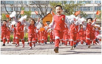 Children in Zhangjiakou of north China’s Hebei province run to welcome the 2022 Beijing Winter Olympics. (Photo provided by a local media of Zhangjiakou)