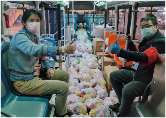 Community workers and volunteers from Tangcai community, Jianghan district, Wuhan loaded a bus with 11-product packages, Feb. 24, 2020. In order to win the battle against the epidemic, all communities in Wuhan are under closed-off management. Li Changlin/ People’s Daily Online