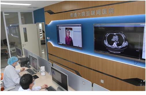 Photo taken on May 8 shows Mao Liping (left), chief physician at the Sixth People’s Hospital of Nantong, inquires about a patient’s physical conditions via a video link. Photo by Xu Congjun/People’s Daily Online