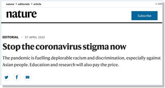 In the editorial entitled “Stop the coronavirus stigma now,” Nature wrote that the World Health Organization (WHO) was implicitly sending a reminder to those who had erroneously associated the virus with Wuhan and with China in their news coverage – including Nature.