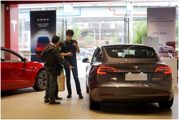 Customers visit the first Tesla experience store which officially opened in the Wujiaochang business district in Shanghai on May 9. Photo by Ma Weiqin/People’s Daily Online