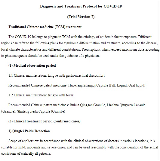 A screenshot of the English-version of the Diagnosis and Treatment Protocol for COVID-19 (Trial Version 7) released by China’s National Administration of Traditional Chinese Medicine. http://ghs.satcm.gov.cn/gongzuodongtai/2020-03-20/14089.html