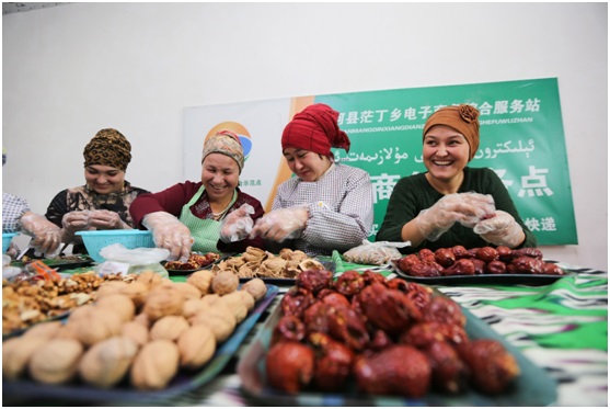 Villagers make a special snack with Chinese dates and walnuts in the e-commerce service center of Beidi village, Jinghe county, northwest China’s Xinjiang Uygur autonomous region. (Photo by Kuerbanjiang Mamuti/People’s Daily Online)
