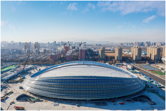 The landmark venue for the 2022 Winter Olympics – the National Speed Skating Oval, also known as the “Ice Ribbon”, is capped, Dec. 31, 2019. Photo by He Yong/People’s Daily